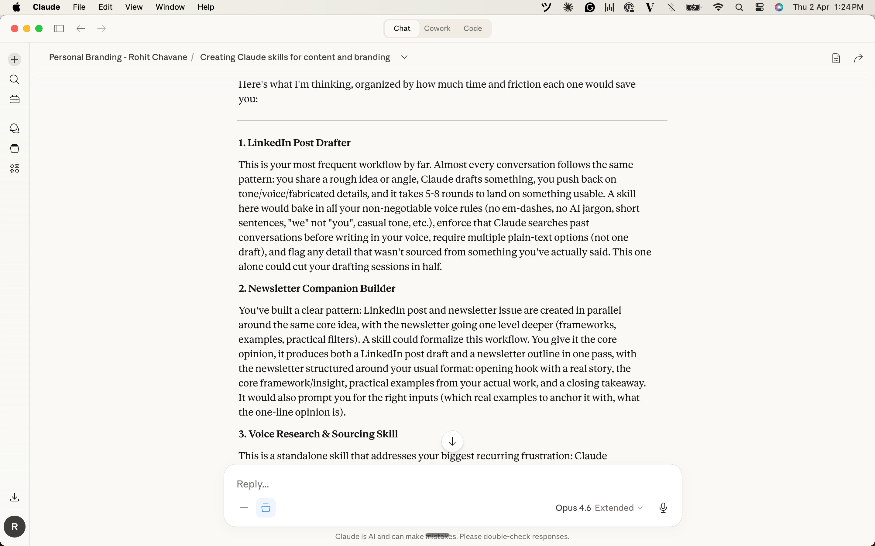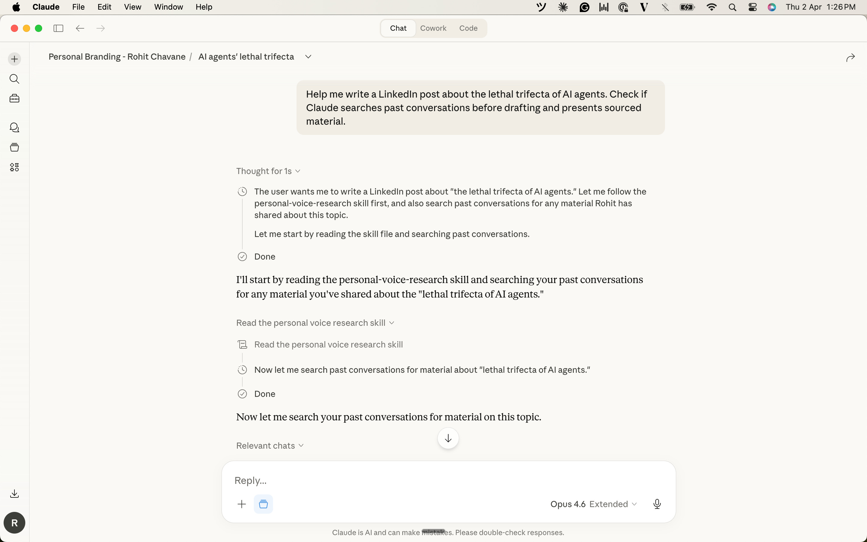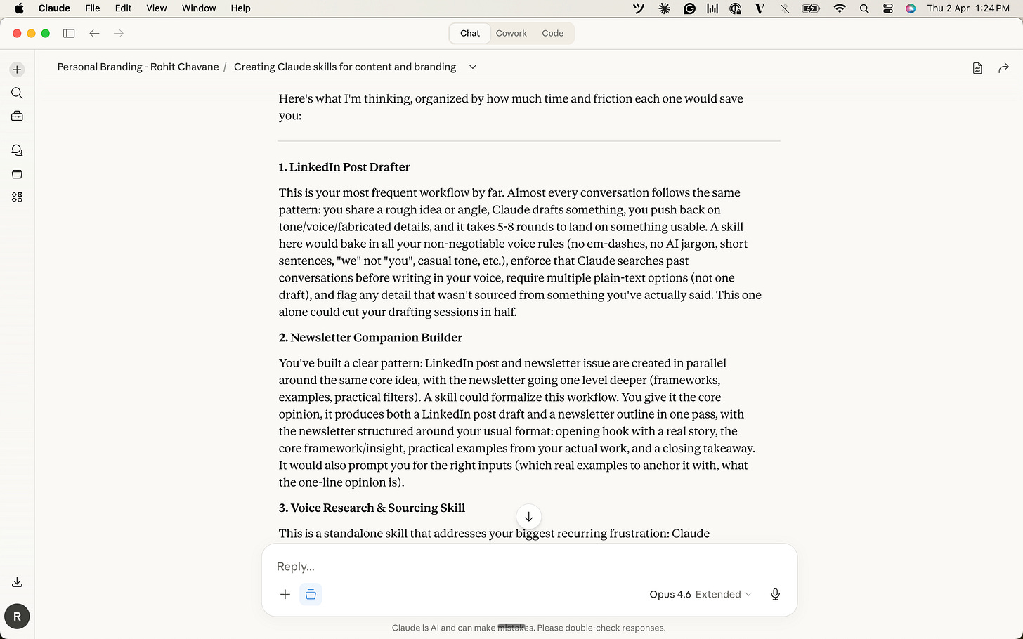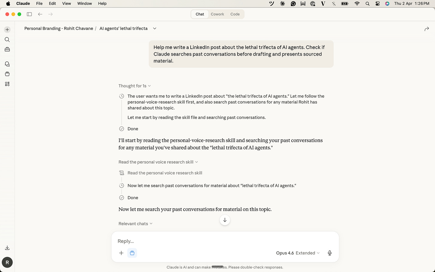 At one point, I asked Claude to write a quick two-line LinkedIn post based on my past opinions. When I looked at the draft, I literally had to ask: “Are those exactly my words, or did you give me these words?”