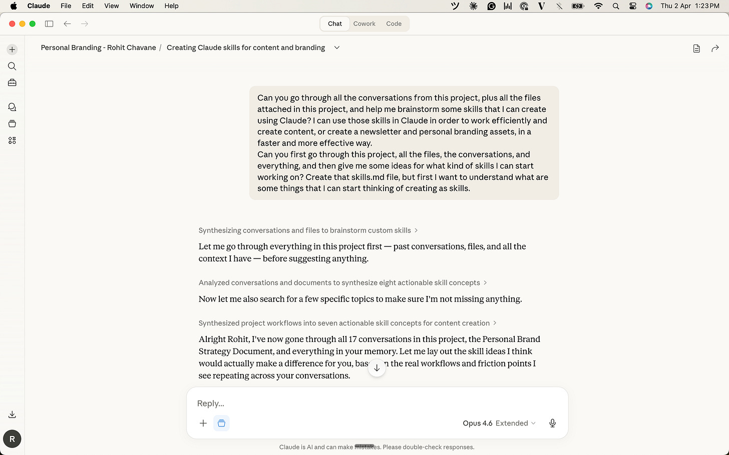 I have a Claude Project where all my personal brand work lives. LinkedIn posts, newsletters, website copy, and brainstorming sessions. Over time, I’d built up 17+ conversations in there, plus attached files like my brand strategy document.
