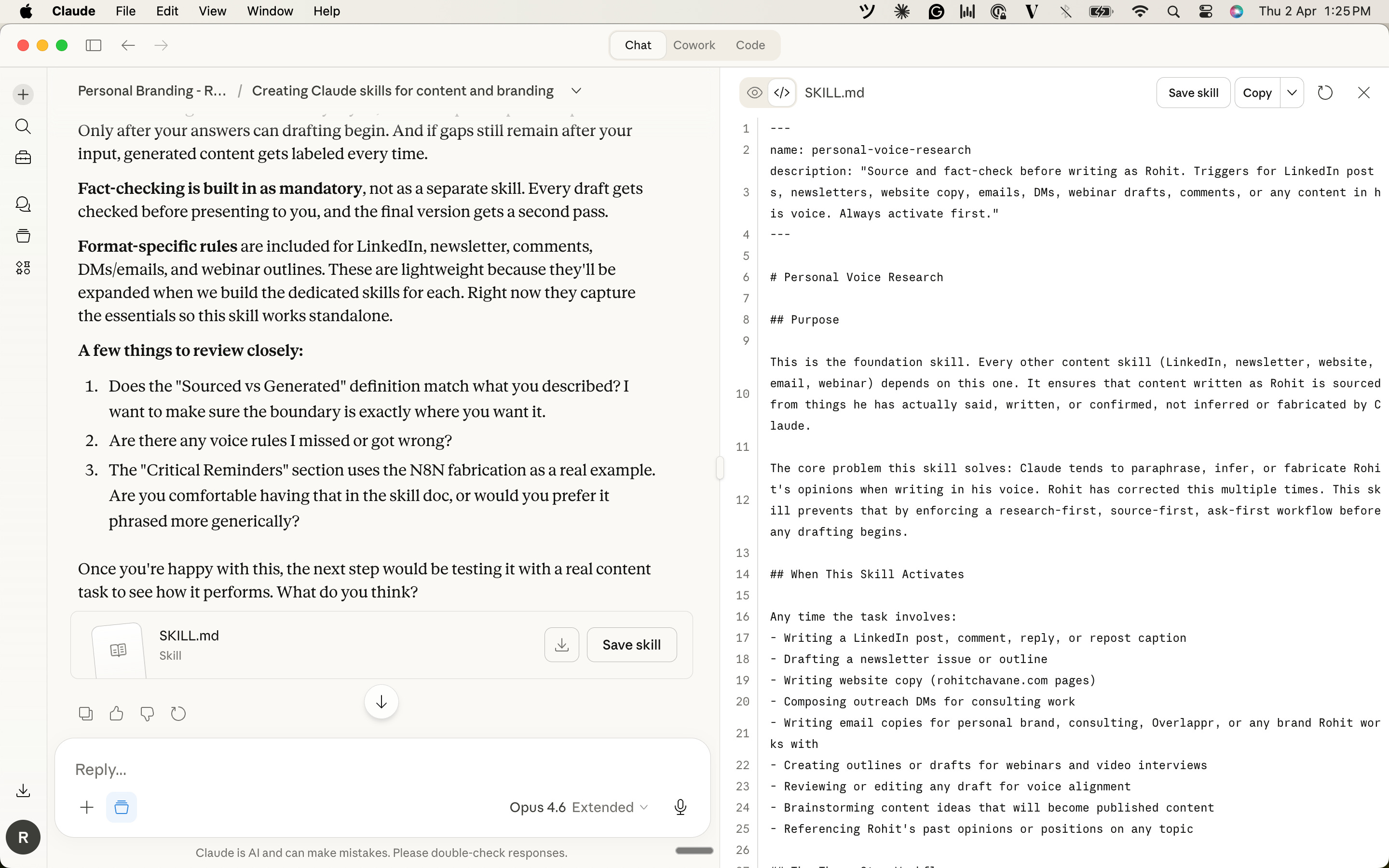 This is the part that surprised me. Claude already knew my voice rules from months of conversations. It knew my frustrations, the corrections I’d made, what I liked and didn’t like. It took all of that and produced the complete SKILL.md file.