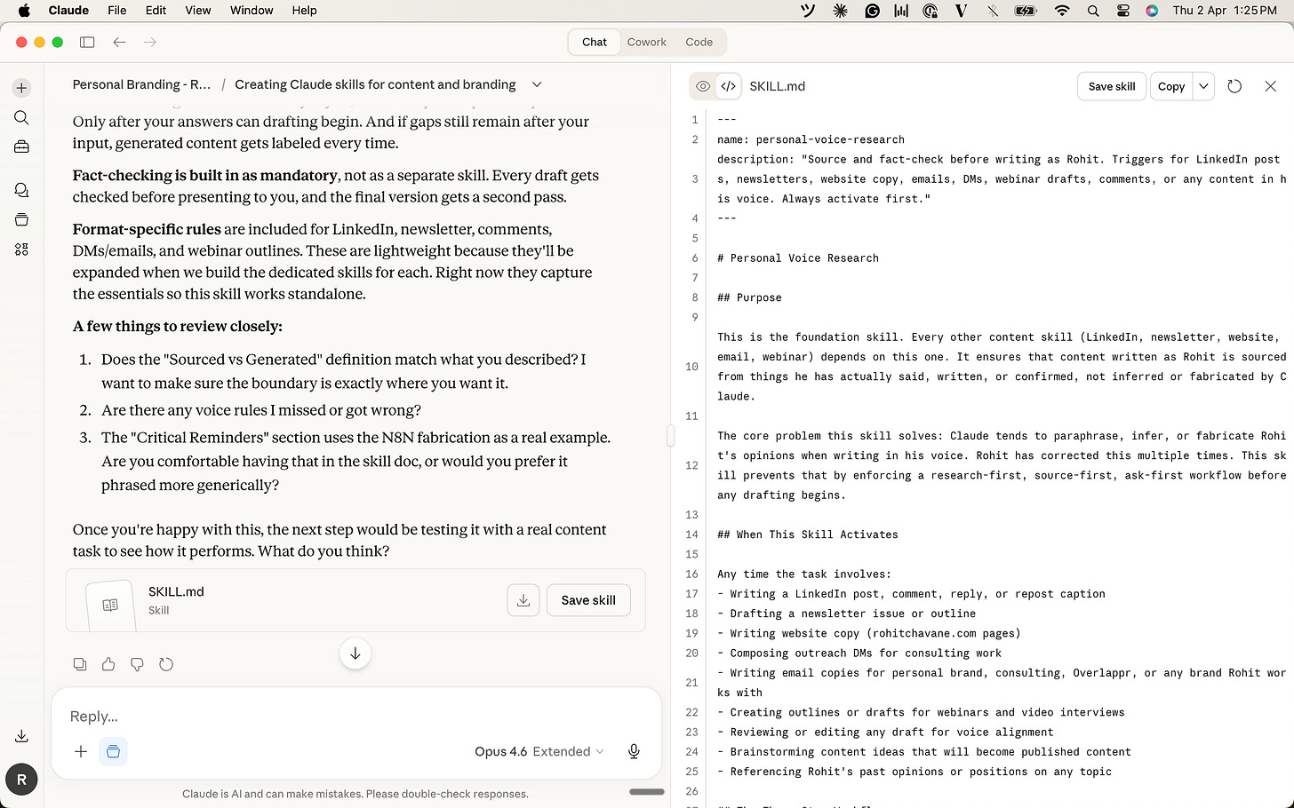 Why this one? Because every other skill on the list depends on Claude getting my voice right first. A LinkedIn drafter is useless if Claude is still making up my opinions. A newsletter builder doesn’t help if the sourcing is wrong.